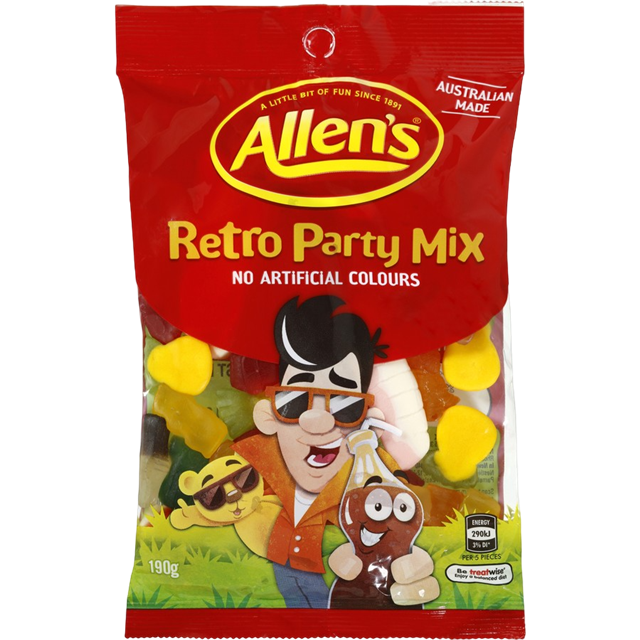 This Allen's Retro Party Mix contains bite-sized lollies, making it a perfect option when you're sharing lollies at work, preparing for a party or creating a dessert buffet The pack contains an assortment of classic lollies including teeth, pineapples, racing cars, strawberries and cream, milk bottles, raspberries, lips, honey bears, cola bottles and retro man No artificial colours Australian made Size: 6 x 1kg bags per carton