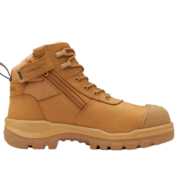 CERTIFIED TO: AS 2210.3:2019 / ASTM F2413-18 INCLUDING EH (CLAUSE 5.6) Materials & Specifications Wheat water-resistant nubuck leather upper safety boot—135mm height 6 eyelet lace up with unique metal free, friction resistant lace rings Laces are manufactured from recycled PET Durable, heavy duty zip with industrial grade zip fastener New lining made from recycled PET offers moisture wicking and long-lasting performance Streamlined TPU toe guard for added leather protection INFINERGY®—E-TPU, a super elastic energy foam that is soft but resilient, providing enhanced cushioning and reducing the impact of every step