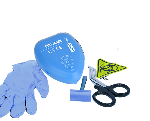 Premium AED preparation kit, comprising a proper surgical razor designed to cope with tough hair, trauma shears for cutting clothing, a drying towel, 2 pairs of nitrile gloves a hazardous waste disposal bag, and a hard cased CPR mask