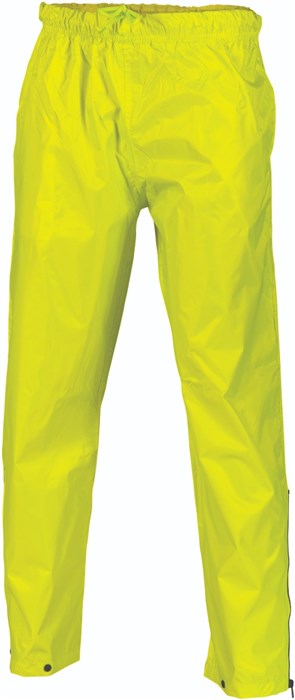 Description: Fabric: 200D polyester/PVC coated Seam-sealed, waterproof outer shell, elastic drawstring waist with leg zippers and press studs closure This Material does not comply with AUS /NZ HiVis Standard