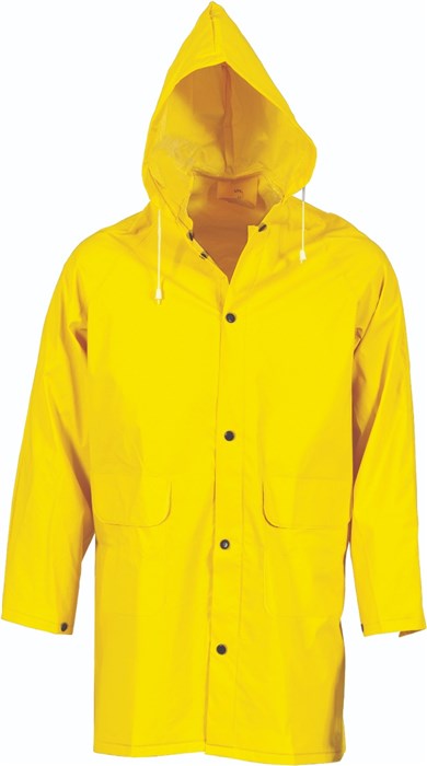 Description: Jacket - PVC/Polyester Coating with Hood Waterproof 2 side flap pocket 3/4 Length This PVC Material does not comply with AUS /NZ HiVis Standard