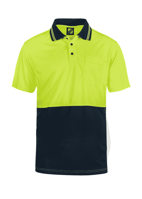 Left chest pocket with pen divide Contrast collar with double stripe detail Solid Hi Vis colour back Day Use Only Garment complies AS/NZS 4602.1:2011 Industrial laundry friendly UPF 50+ Wicks moisture away from skin Keeps the wearer cool Machine washable and dry quickly 100% Polyester Micromesh 157gsm