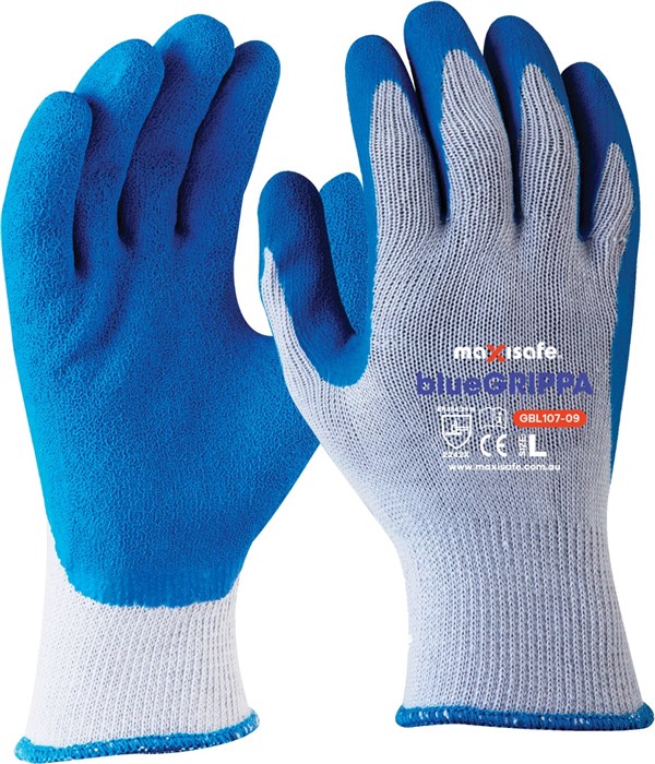 Description Blue Grippa Latex Glove Grey 100% seamless polyester cotton liner Blue latex crinkle finish coating provides superior wet and dry grip Ergonomic design provides excellent flexibility Extremely durable offering excellent abrasion, tear and puncture resistance Certified to EN388:2016 2.2.4.2.X RECOMMENDED USES Construction and Timber Industry Glass and Sheet Metal handling Refuse Disposal and Recycling Agriculture and Gardening