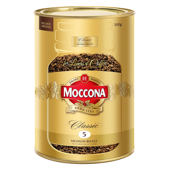 This is a medium roast coffee blend made from a blend of Arabica and Robusta coffee beans This coffee is medium roasted and instant so you can enjoy a hot coffee straight away This Moccona Classic Medium Roast Coffee comes in a 500 g tin so you can stock up the tea room in the workplace or the pantry at home It comes packaged in a tin to keep the coffee inside fresh Size: 500g Tin