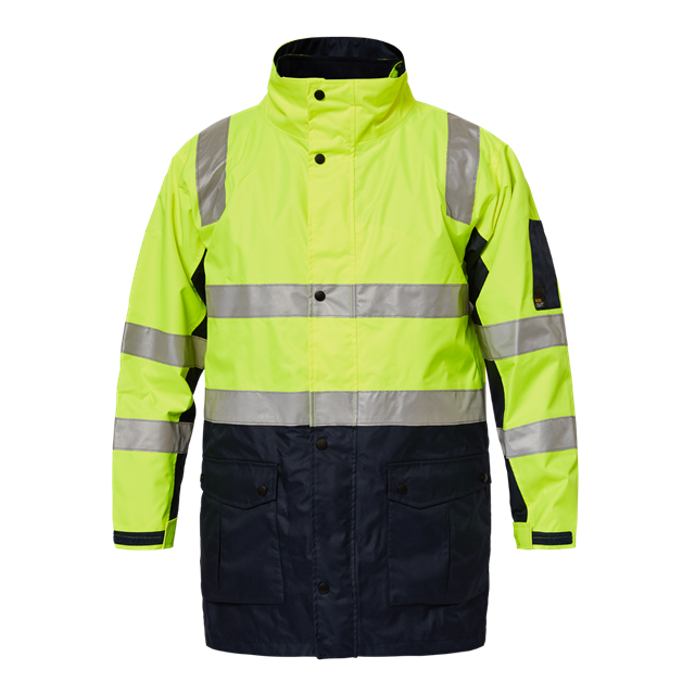 Fully concealed zip front with press studs Fully Seam Sealed Waterproof - 12000mm - Outer Jacket Breathable - 3000mvp Windproof CSR 1303-6 Reflective Tape For Domestic Wash Bio-Motion configuration Fully Lined Front patch pockets with side hand warmer pockets, napolean pocket and LHS internal pocke Adjustable tabs at cuff Concealed Hood Embroidery access zip above hem ID patch holder on side pocket Comply to Day/Night Use Garment Complies AS/NZS 4602.1:2011 Features - INNER VEST Polar Fleece with Anti-Pill Face on reversible vest Waterproof - 12000mm on hi vis side Breathable - 3000mvp CSR 1303-6 Reflective Tape For Domestic Wash Hand warmer pockets on both sides Embroidery access zip on side seam ID patch holder on side pocket Hi Vis side comply to Day/Night Use only Garment Complies AS/NZS 4602.1:2011