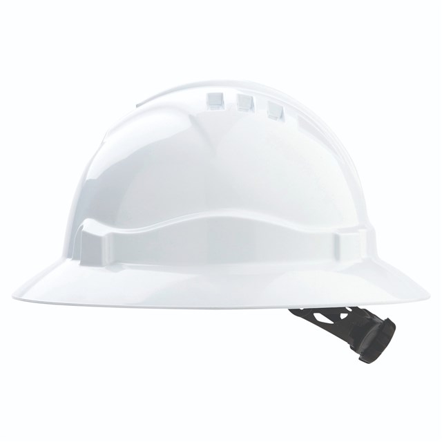 Description: Lightweight, durable ABS shell Unvented for situations where full head enclosure is required 6 point ratchet harness Sweatband prevents perspiration build-up Full brim extends coverage to over the neck & ears Slightly shorter front peak allowing for good upward vision Sold Individually Qty/Carton - 20