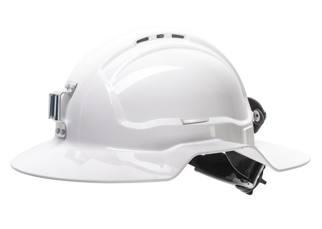 White Broadbrim hard hat with metal miners bracket - Made in Australia